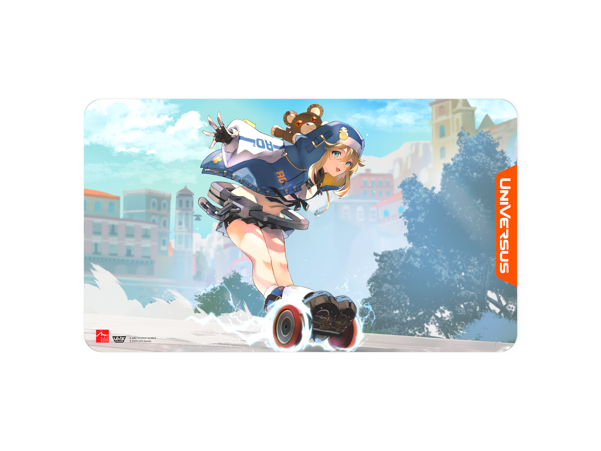 This one’s special — exclusive artwork of Bridget illustrated by Sumeragi. The pose, the motion, the color all pops instantly. It brings personality to the table before the first card is even played. Whether you’re here to express, outplay, or just play with a little more style, this is the kind of playmat that becomes part of your identity as a player.