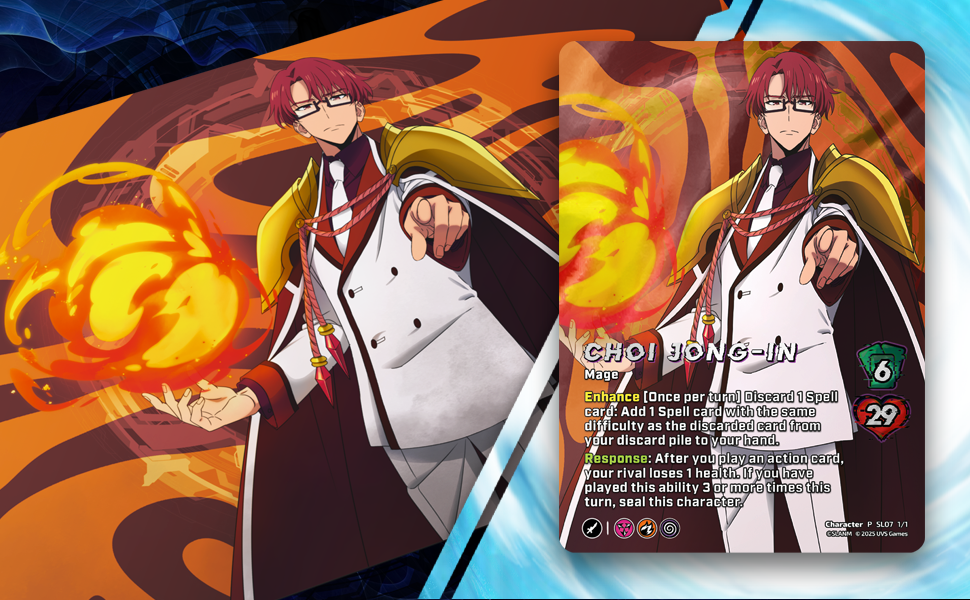 The Solo Leveling S-Rank Hunter Bundle – Choi Jong-In showcases Korea’s top mage in bold, fiery style. Featuring exclusive Solo Leveling artwork, this UniVersus Experience Bundle pairs a collectible foil character card with a premium full-art playmat that radiates elemental power and tactical precision.