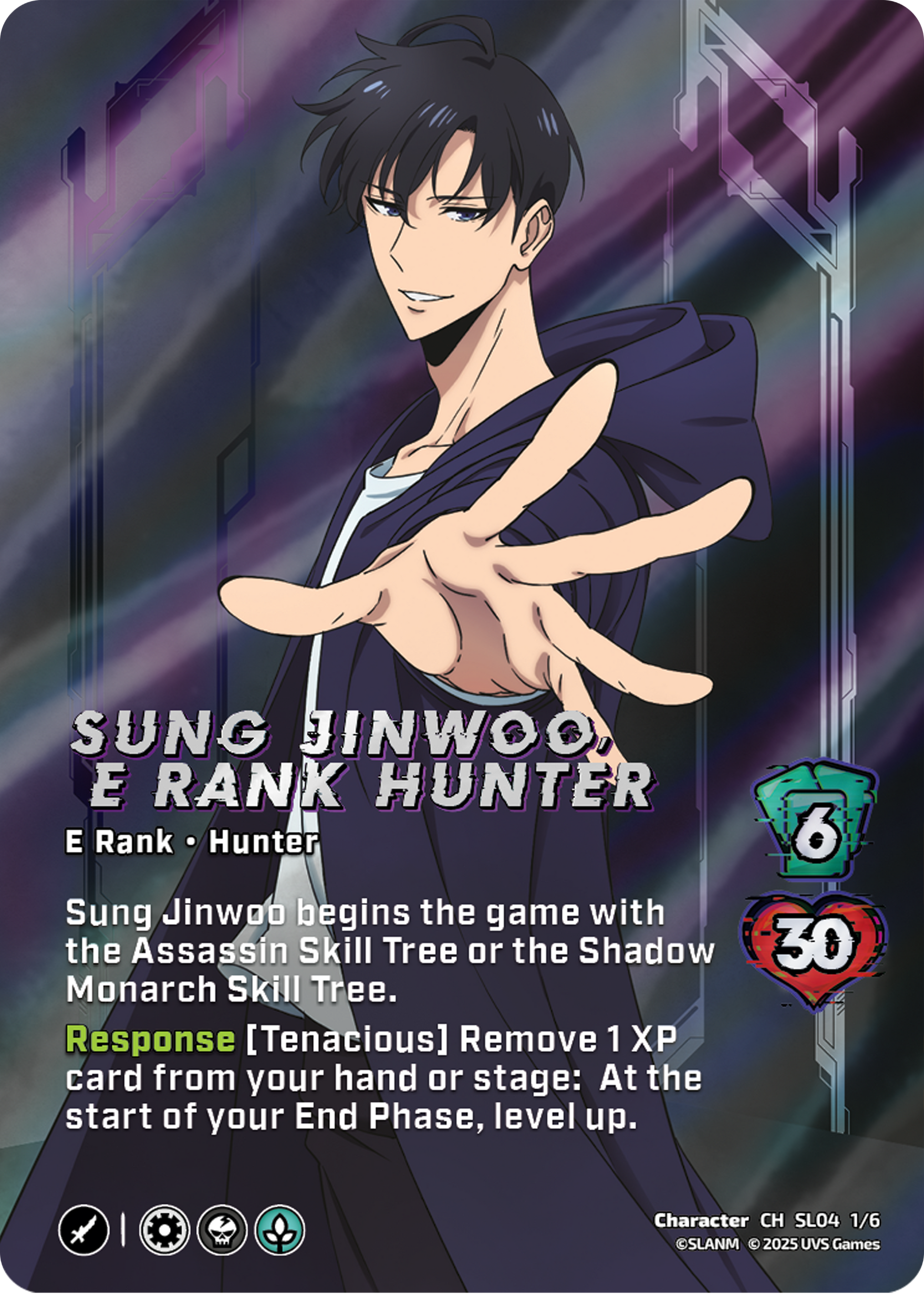 This bundle includes a complete 6-card foil set, featuring double-sided cards that expand his gameplay with the Shadow Monarch Skill Tree. Each card introduces unique mechanics and abilities to enhance your UniVersus deck.