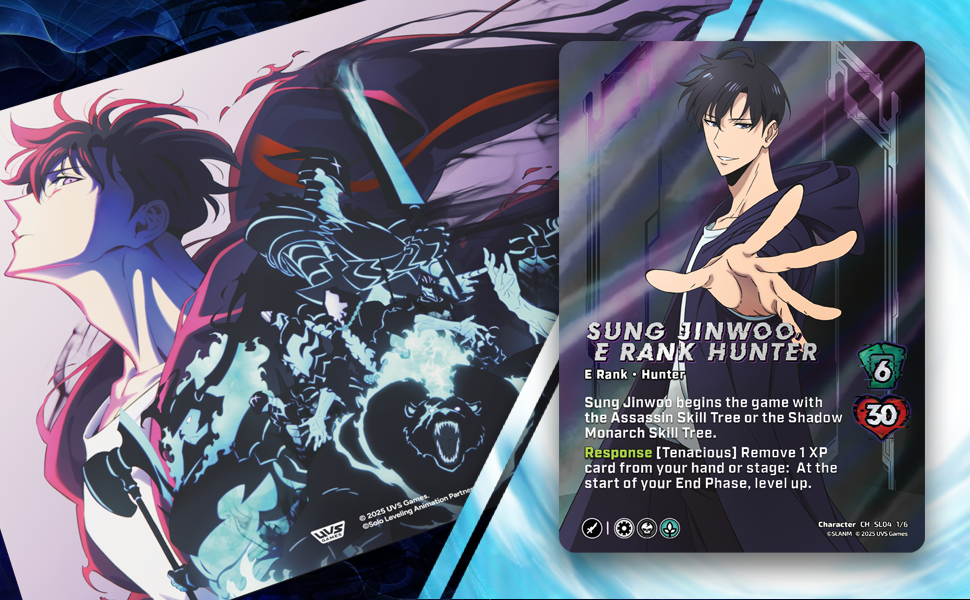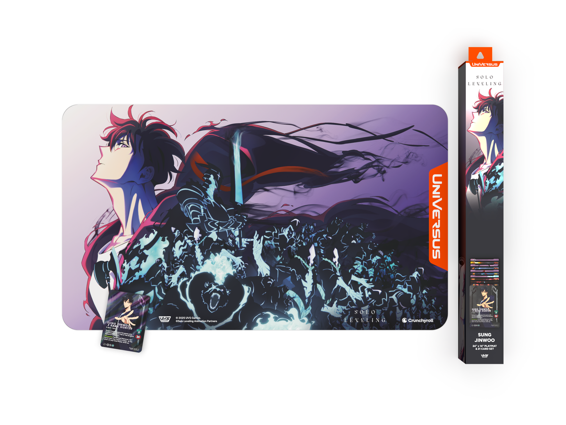 Step into the world of Solo Leveling with the UniVersus Collectible Card Game Experience Bundle Series. Each premium bundle spotlights a legendary Hunter through exclusive artwork, a collectible foil character card, and a matching full-art playmat.